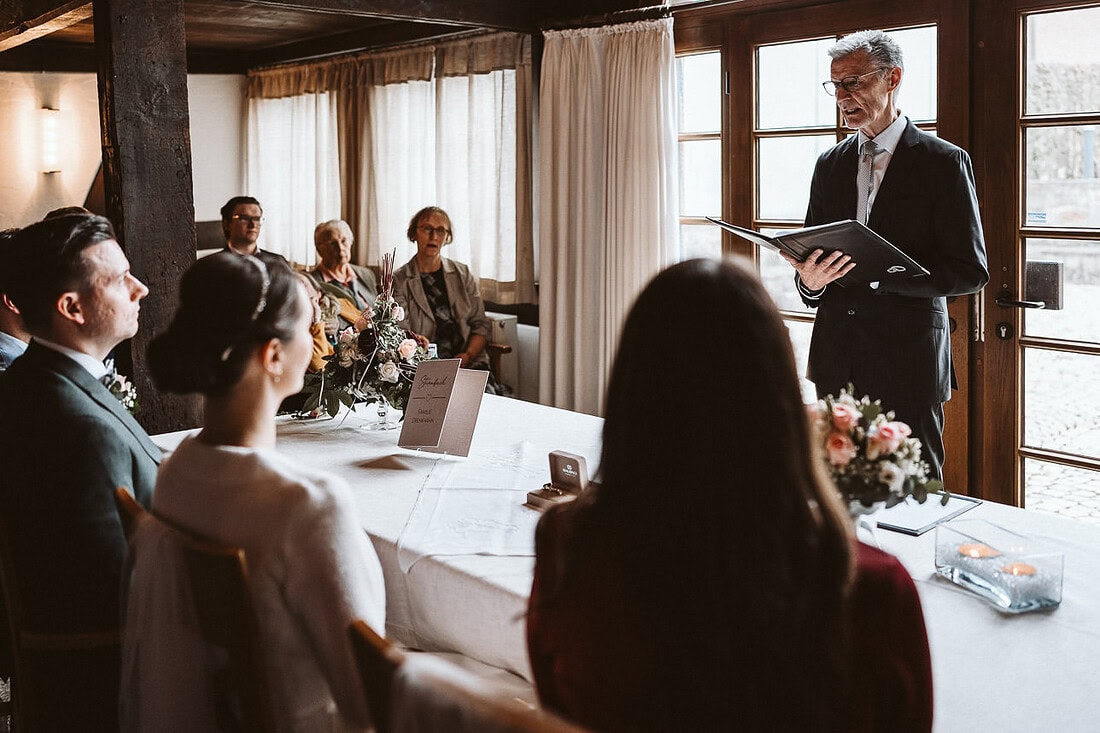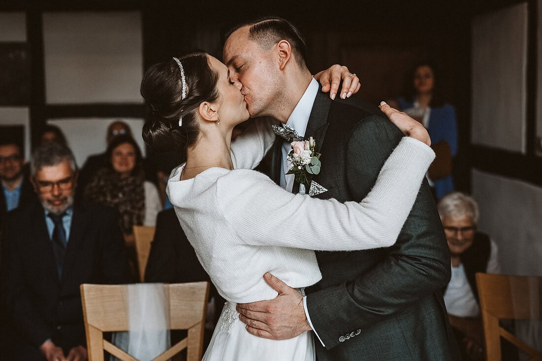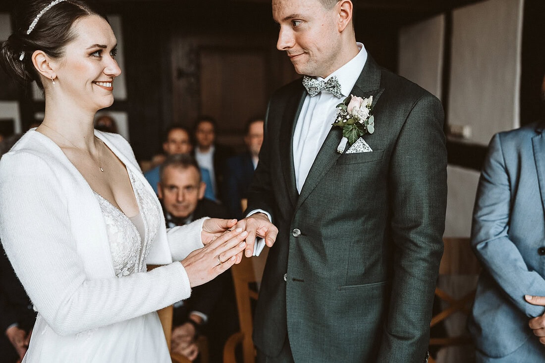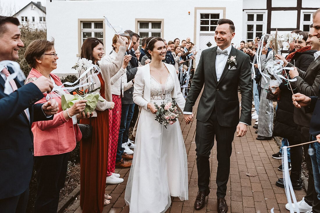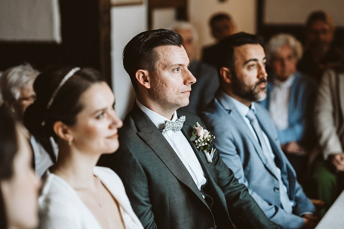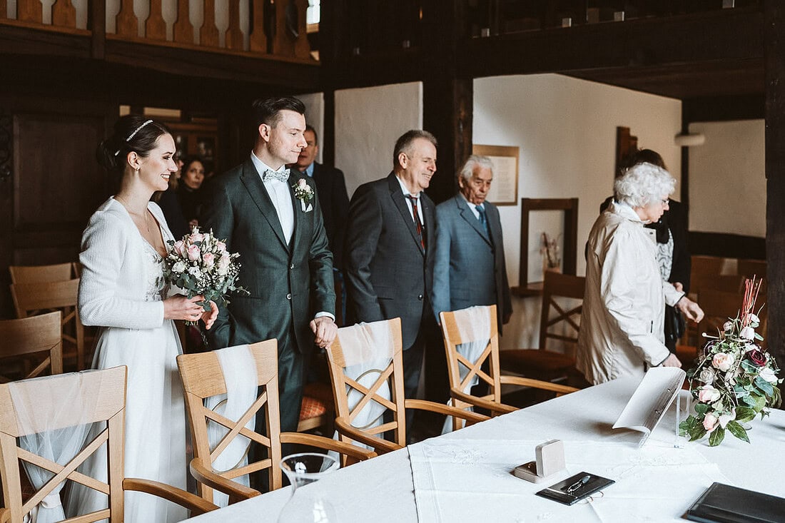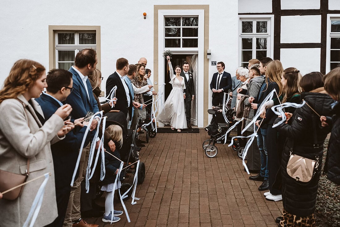 Kurz darauf trafen die Gäste ein, und es folgte eine sehr persönliche und emotionale standesamtliche Trauung in der charmanten Atmosphäre der Alten Vikarie. Nach der Zeremonie überraschten die Gäste das frisch verheiratete Paar mit einem herzlichen Empfang vor der Location – ein rundum schöner und stimmungsvoller Moment.