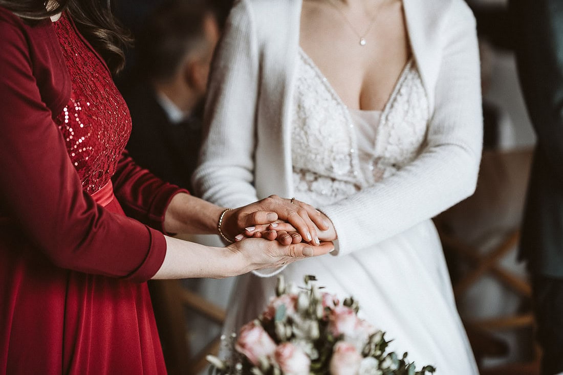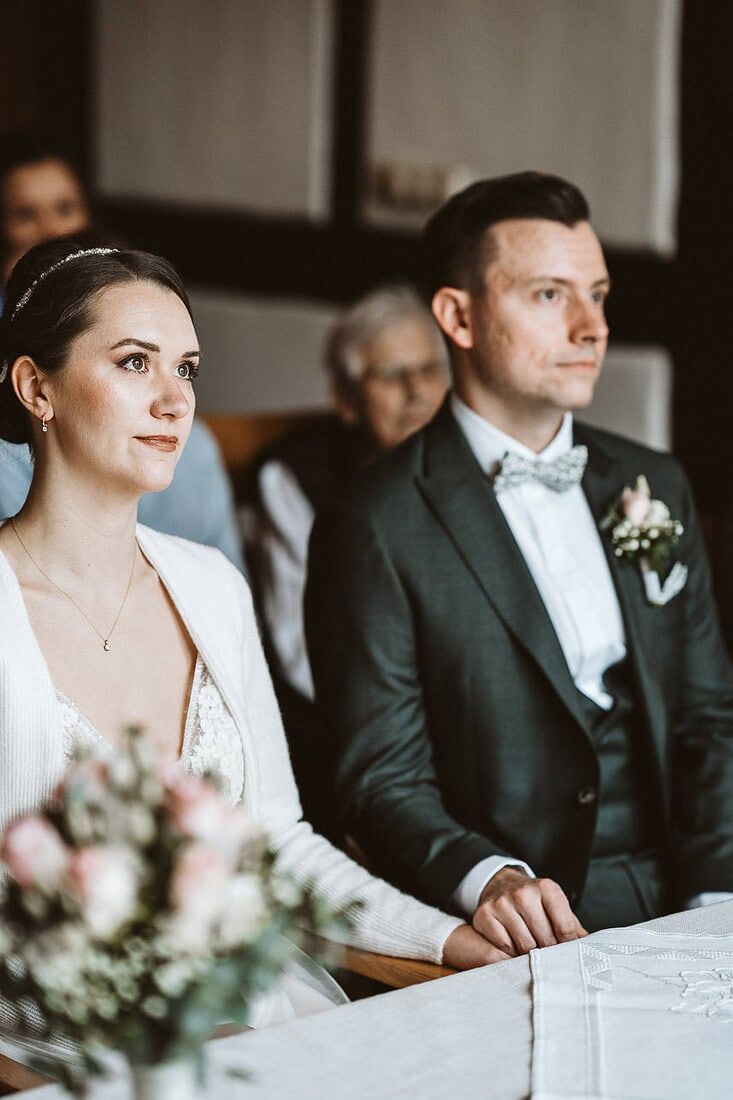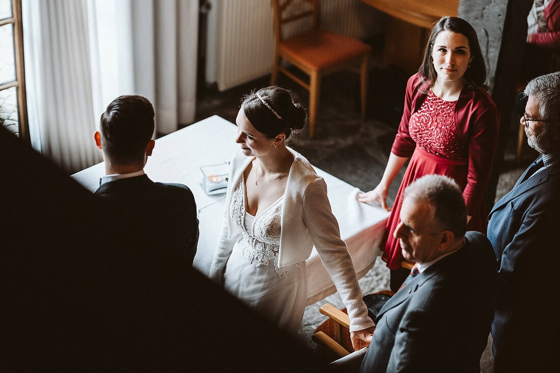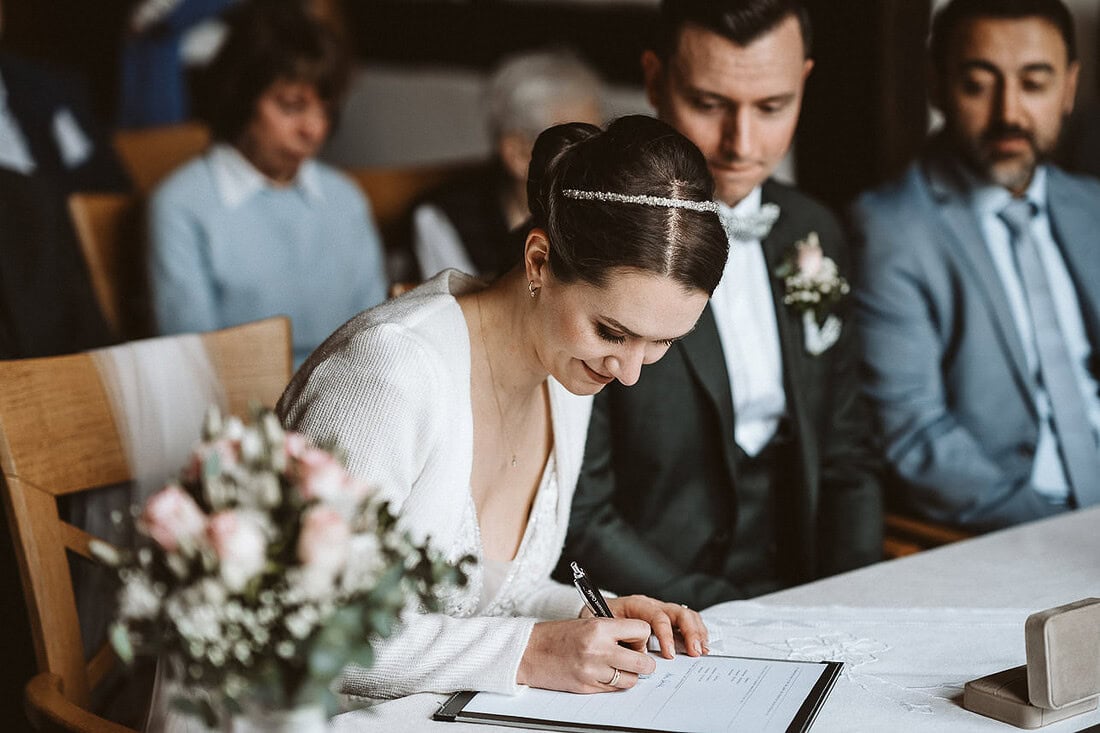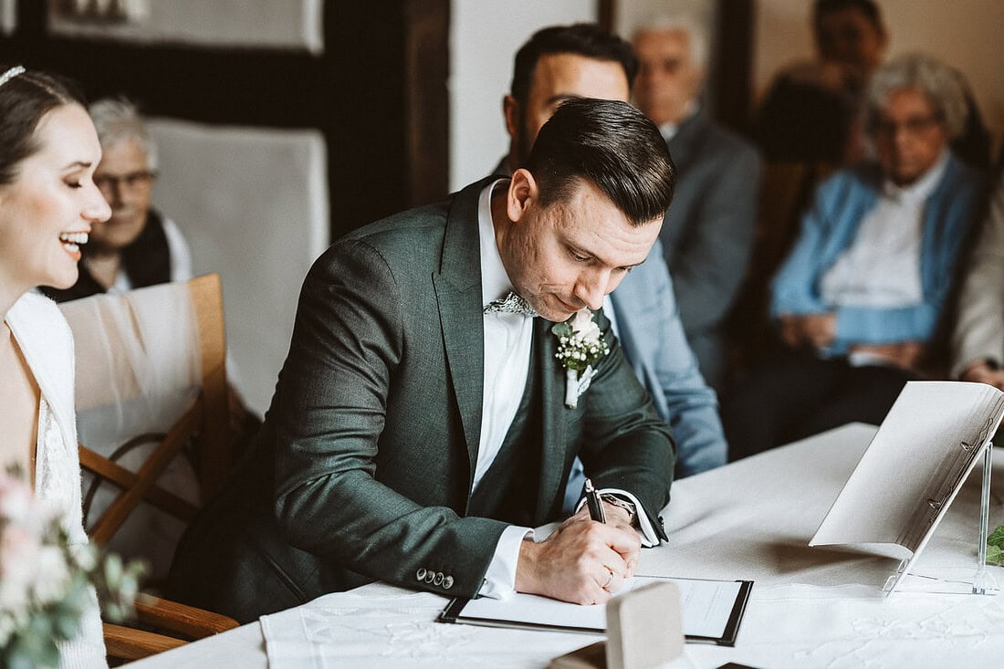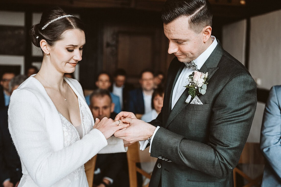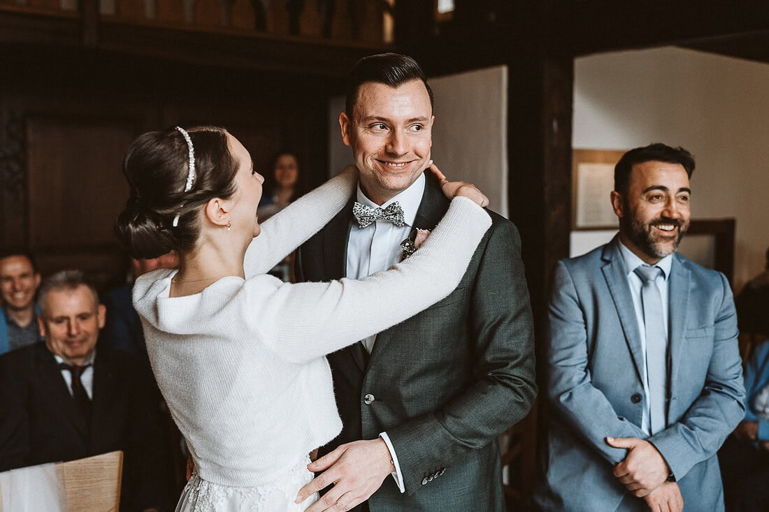 Kurz darauf trafen die Gäste ein, und es folgte eine sehr persönliche und emotionale standesamtliche Trauung in der charmanten Atmosphäre der Alten Vikarie. Nach der Zeremonie überraschten die Gäste das frisch verheiratete Paar mit einem herzlichen Empfang vor der Location – ein rundum schöner und stimmungsvoller Moment.