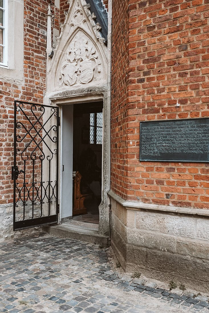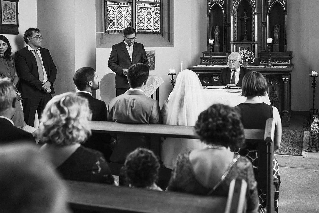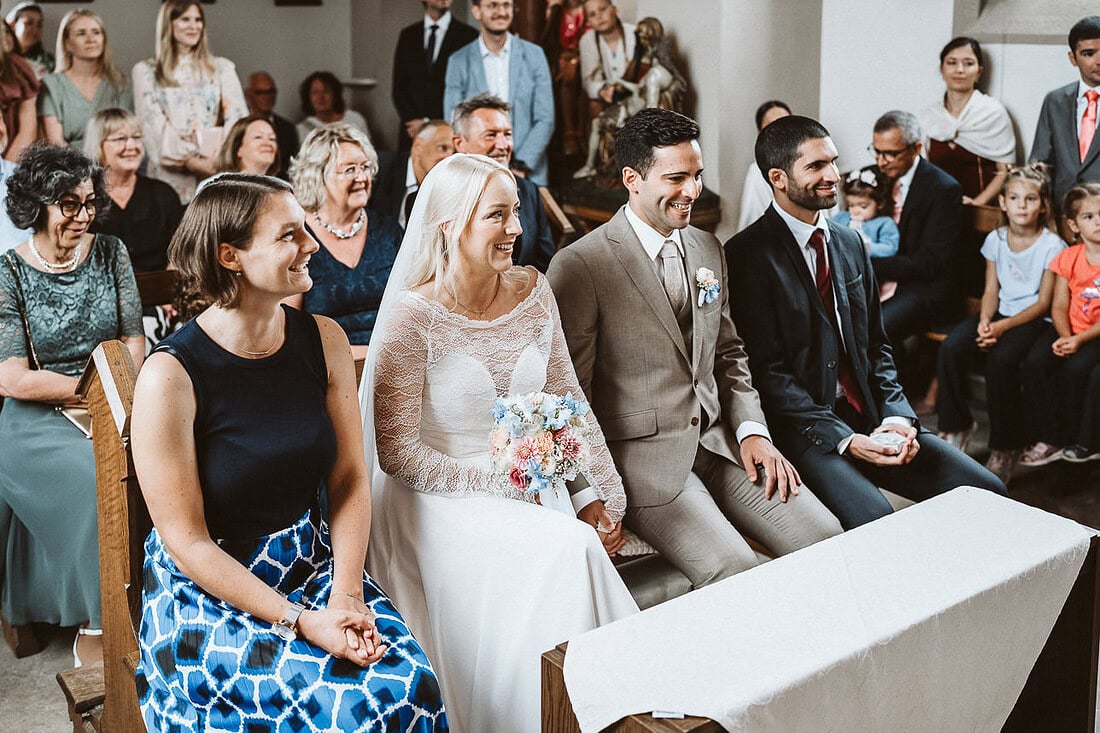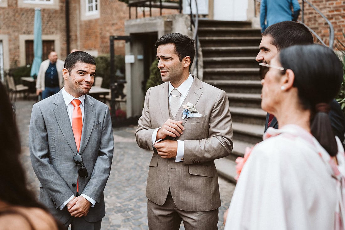 Anschließend fand die standesamtliche Trauung in der ehemaligen Kapelle der Burg Hülshoff statt. Da ein großer Teil der Familie aus Portugal angereist war, war der Raum gut gefüllt – einige Gäste standen, aber jeder fand seinen Platz. Damit auch alle Angehörigen die Trauung verfolgen konnten, hatten J&J einen Dolmetscher organisiert, was die Zeremonie für alle besonders persönlich machte. Nach dem Ja-Wort folgten ein Spalier, herzliche Gratulationen und ein entspannter Sektempfang vor der Kapelle.