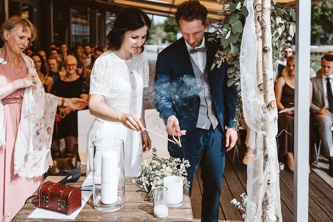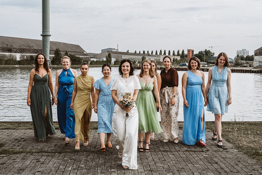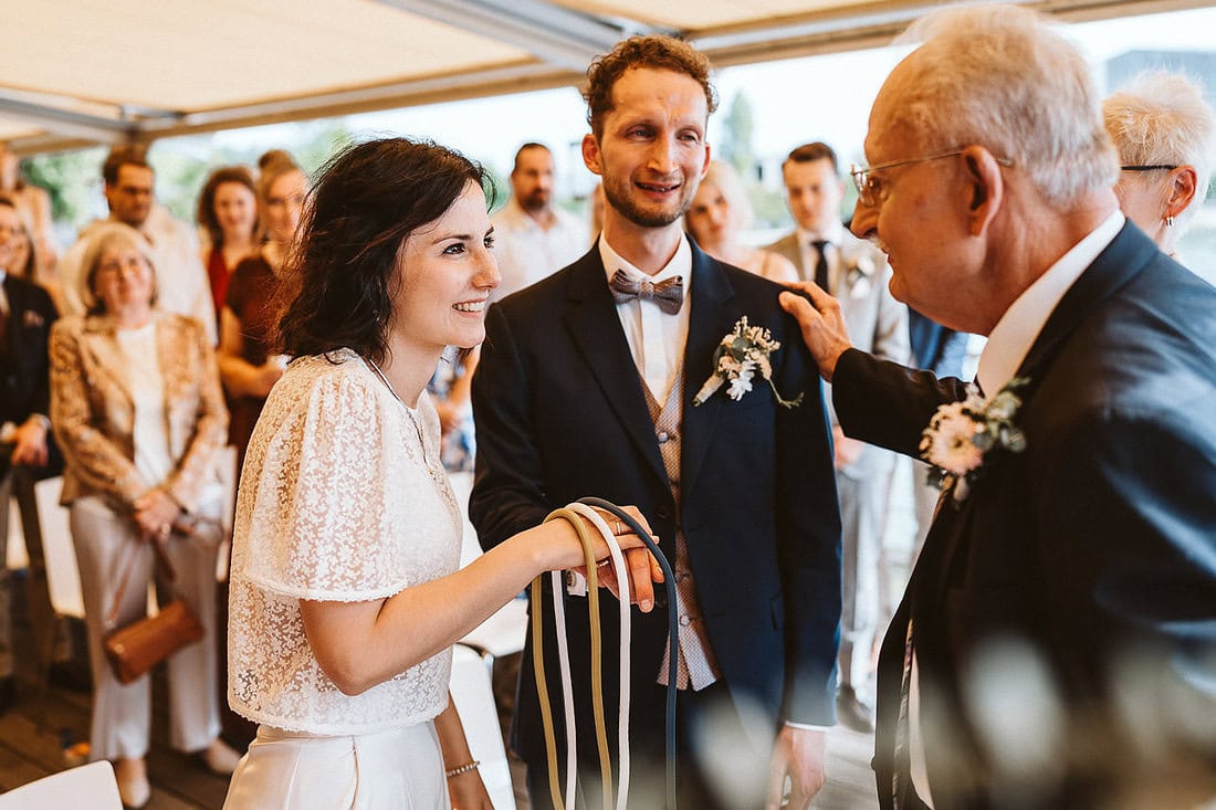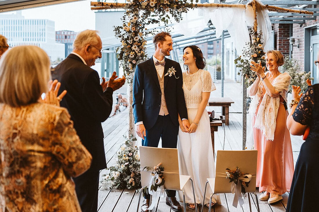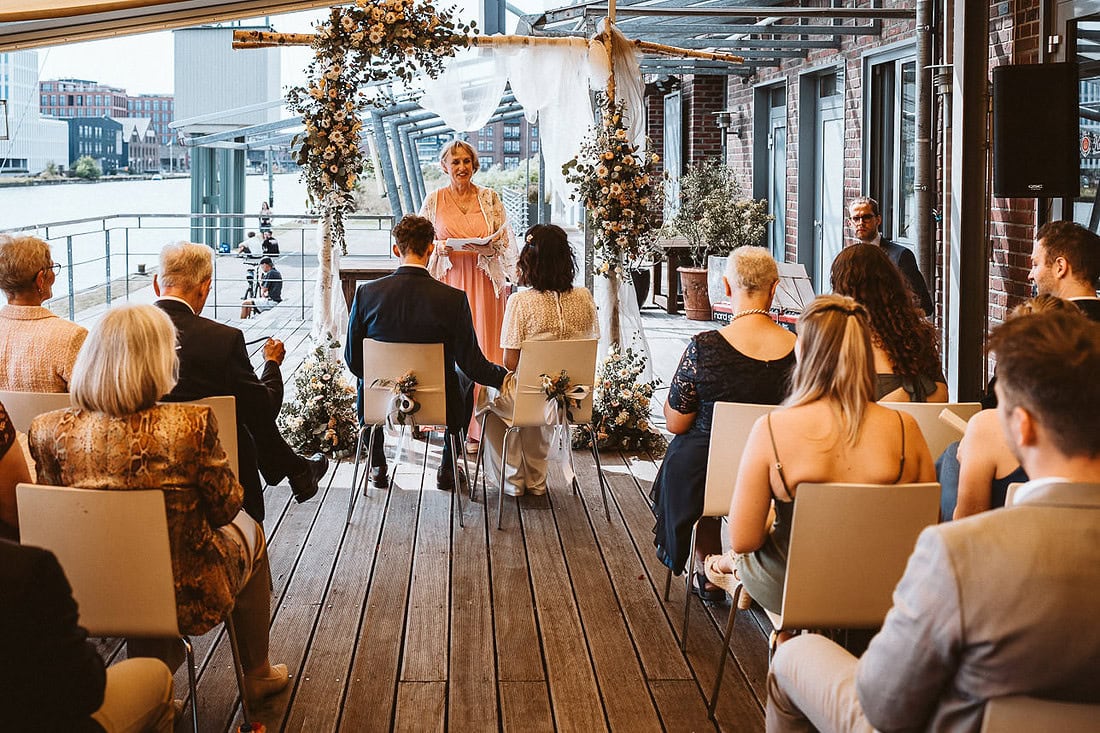 Die Trauung auf der Terrasse des esCape wurde von Traurednerin Silvia wunderschön durchgeführt. Unter einem wunderschönen Traubogen und begleitet von Familie und Freunden gaben sich die Beiden das Ja-Wort. Danach blieb Zeit, den Moment mit kühlen Getränken und netten Gesprächen zu genießen. Besonders viel Spaß hatten alle bei den kreativen Gruppenfotos direkt an der Hafenkante – ein echtes Highlight des Nachmittags.