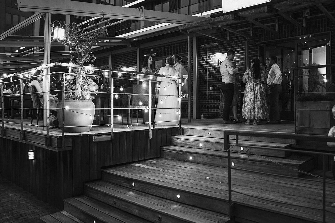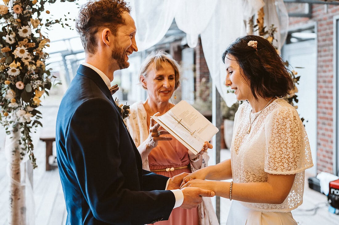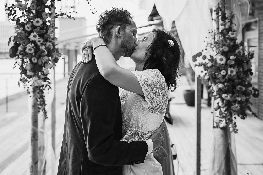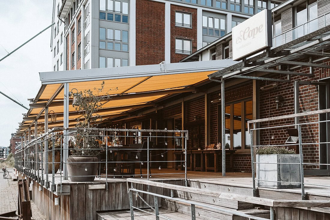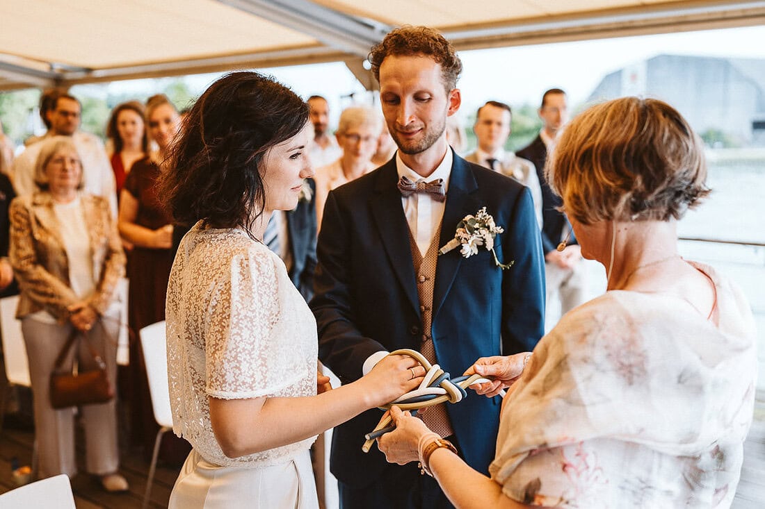 Die Trauung auf der Terrasse des esCape wurde von Traurednerin Silvia wunderschön durchgeführt. Unter einem wunderschönen Traubogen und begleitet von Familie und Freunden gaben sich die Beiden das Ja-Wort. Danach blieb Zeit, den Moment mit kühlen Getränken und netten Gesprächen zu genießen. Besonders viel Spaß hatten alle bei den kreativen Gruppenfotos direkt an der Hafenkante – ein echtes Highlight des Nachmittags.