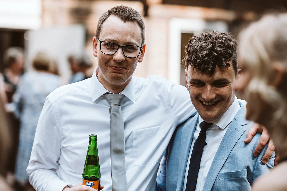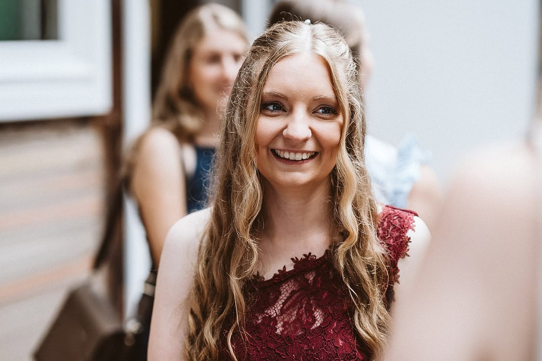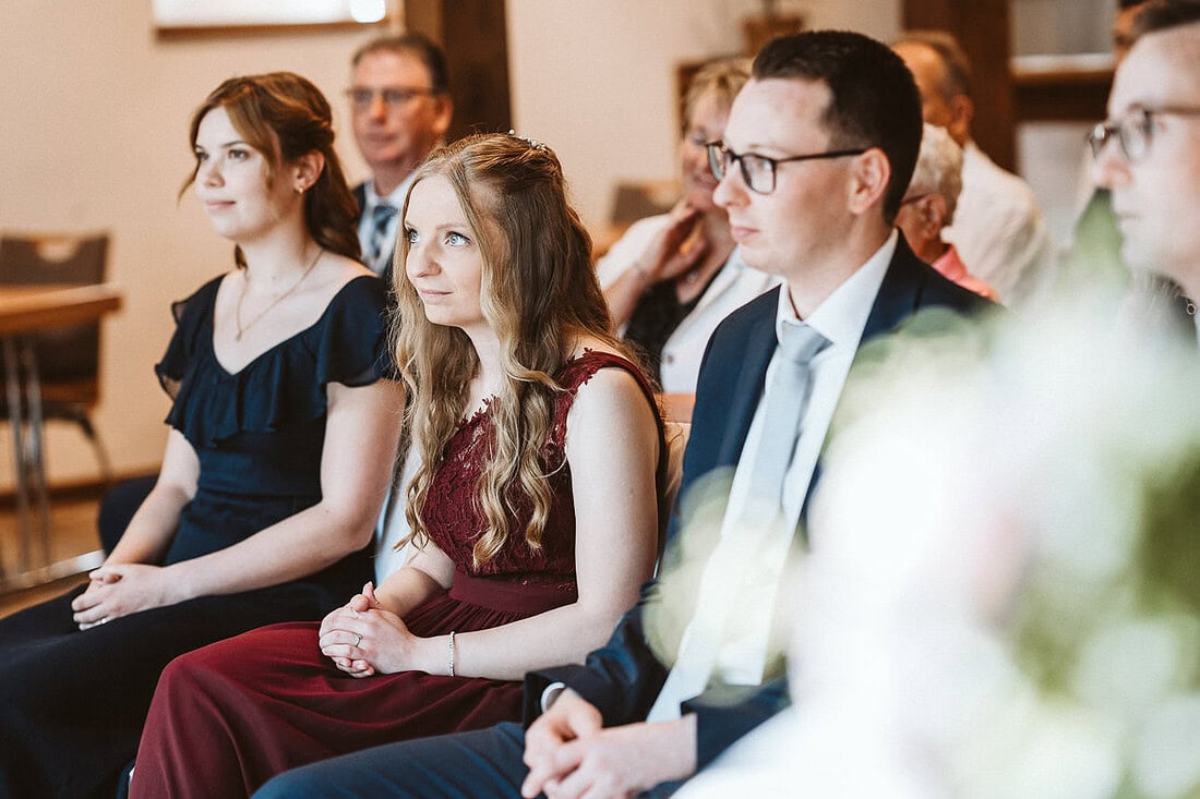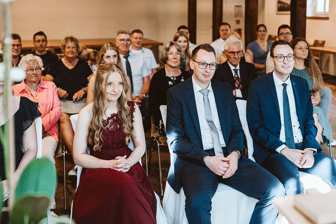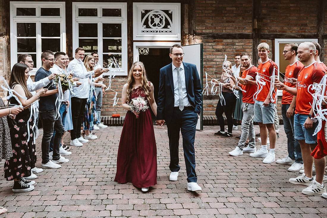 Kurz danach trafen die ersten Gäste ein und die standesamtliche Trauung begann. Das Bürgerhaus, liebevoll restauriert und voller Charakter, bot dafür eine wunderbare Kulisse. Nach der Trauung wurden K&J mit einem herzlichen Spalier vor dem Gebäude überrascht. Für den anschließenden Empfang bot die Terrasse hinter dem Bürgerhaus den idealen Ort – schattig, einladend und perfekt für entspannte Gespräche in sommerlicher Atmosphäre.